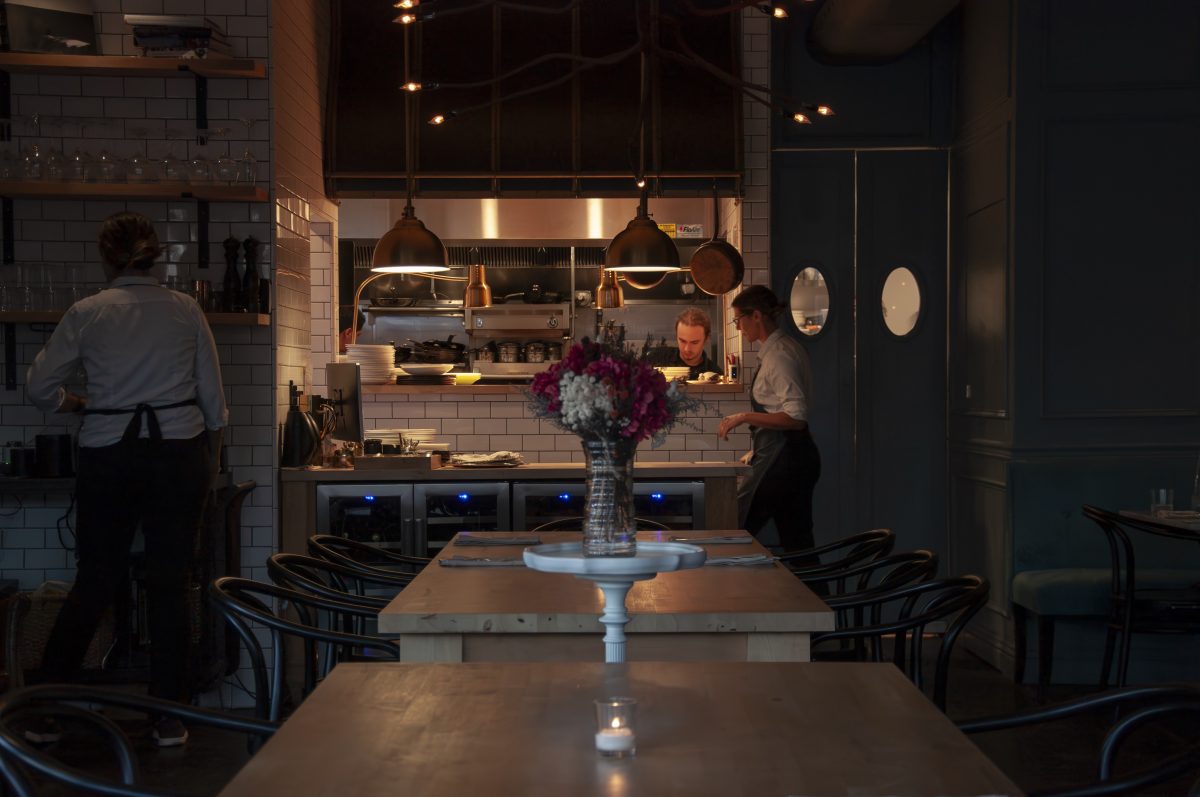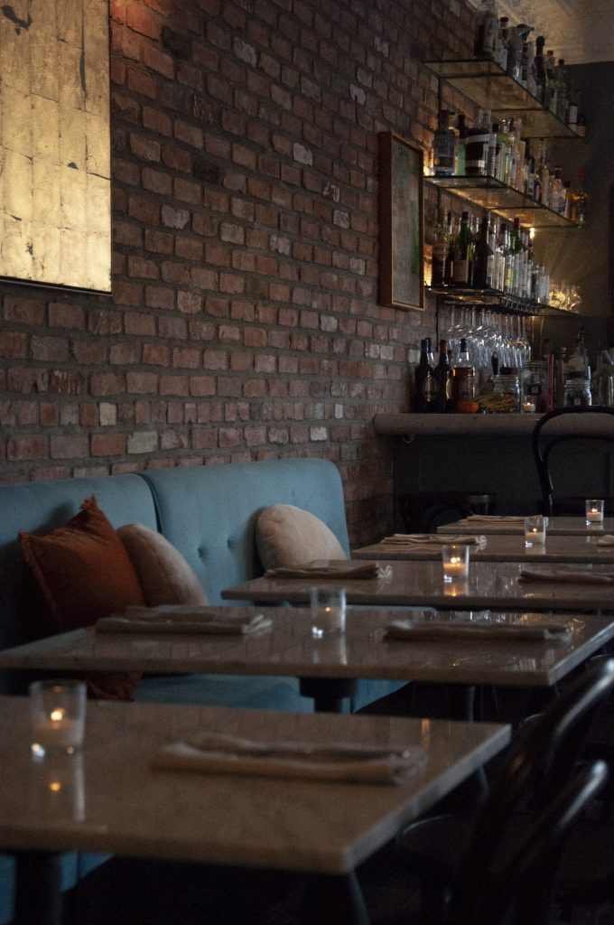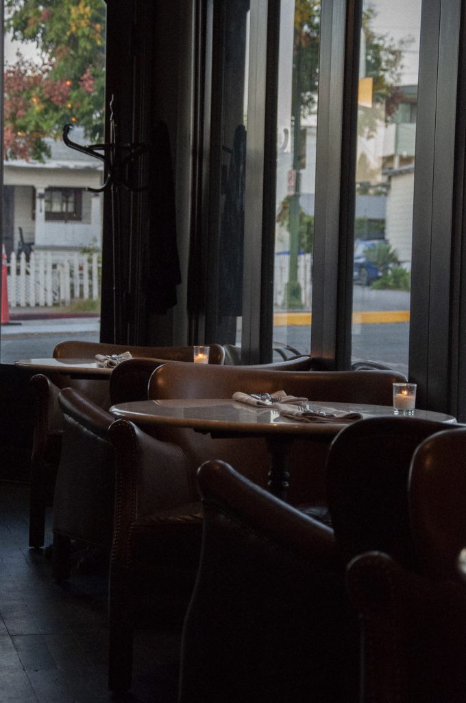 Two big wood tables are at the center of the room, framed with small bistro tables along the walls and windows. Unless you are a big group, you will most likely share the big table with another party. Bringing people together and creating a sense of communal dinner experience that is inviting, warm, and intimate. Benches and leather armchairs make for comfortable seating that lets you linger, order another bottle of wine, and philosophize with your partner or a group of friends, create memories, and simply be.