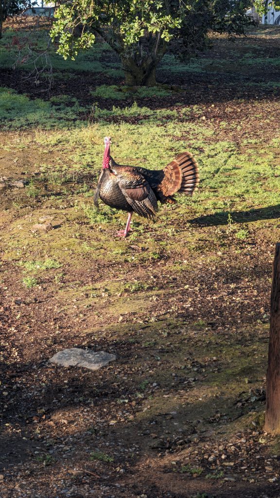 The next morning, we were up bright and early, and we had our first wildlife experience. After I got up, I took our dog Robby for a walk, and we ran into Tom, the turkey. Fleming Meadows campground on Don Pedro Reservoir has its own rafter of wild turkeys. Robby was really excited and wanted to say hi, but Tom did not seem to be interested in making an acquaintance. Oh well. We continued our walk down to the boat ramp and enjoyed the beautiful view of the huge reservoir.