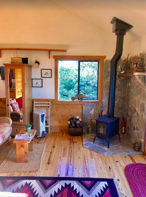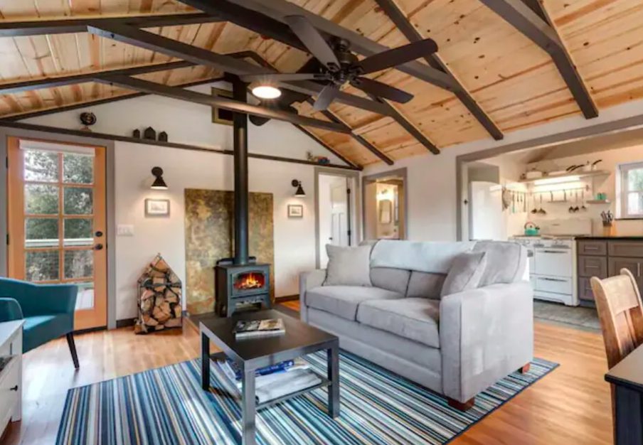 The property is similar to a treehouse, nestled away behind oak trees. It’s fitted with pine vaulted ceilings and walls, a fireplace with a gas insert, and lovely decking for relaxation while reading the newspaper or listening to birds chirp as the sun rises.