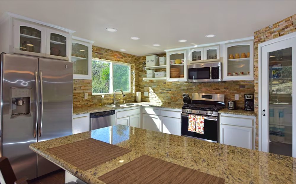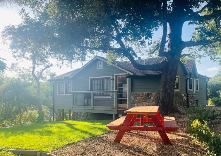 The two bedroom property sleeps four people and sits on half an acre hidden behind a grove of oak trees. It was fully remodeled in 2017, so it has the best facilities, featuring a kitchen with the latest cookware and a Nest thermostat for heating and cooling.