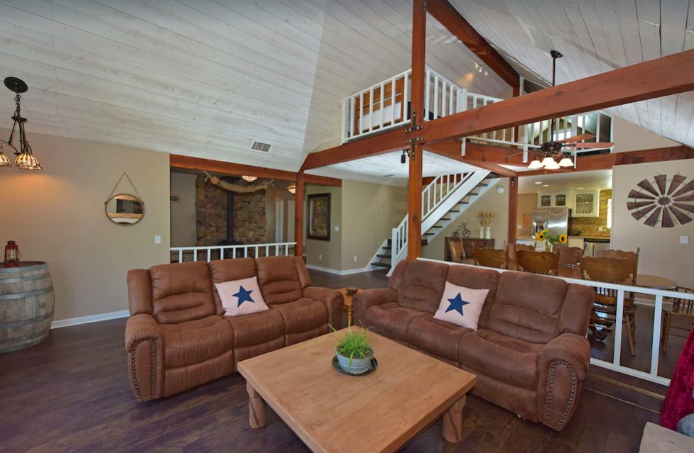 This alluring, spacious cabin sleeps fourteen people with three bedrooms and seven beds. It’s thoughtfully designed for larger families. The home provides groups the space to spread out while still enjoying each others company.